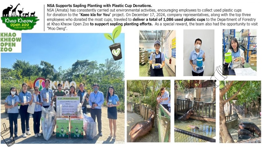 NSA (Amata) has consistently carried out environmental activities, encouraging employees to collect used plastic cups for donation to the "Kaeo kla for You" project. On December 17, 2024