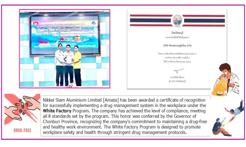 Nikkei Siam Aluminium Limited [Amata] has been awarded a certificate of recognition for successfully implementing a drug management system in the workplace under the White Factory Program.